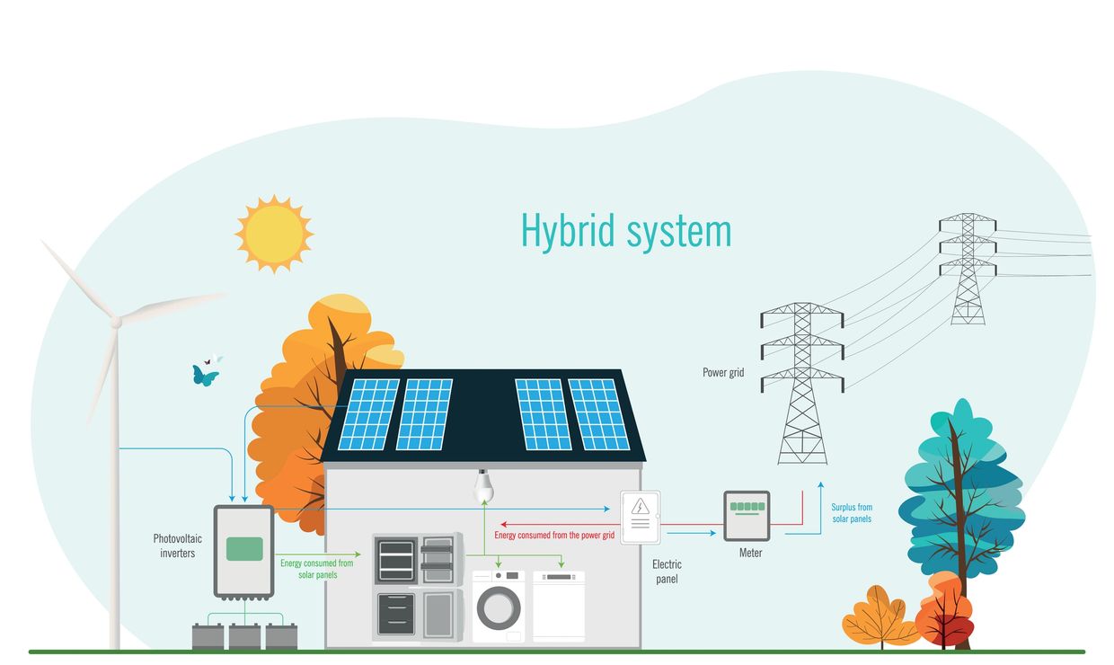 A hybrid solar system combines grid-tied and battery storage, offering the best of both worlds—reliability, cost savings, and energy independence. It allows homeowners to store excess solar power for use during outages or peak pricing times while remaining connected to the grid for backup when needed.
